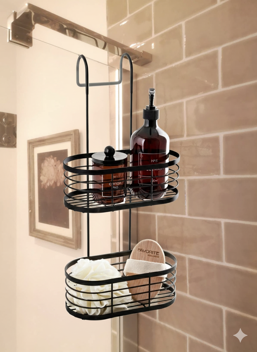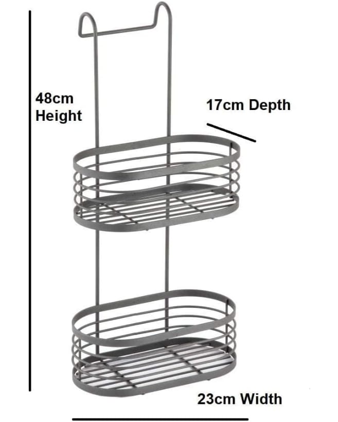 - Non-rust plastic-coated caddy designed to hang over your shower screen or door.